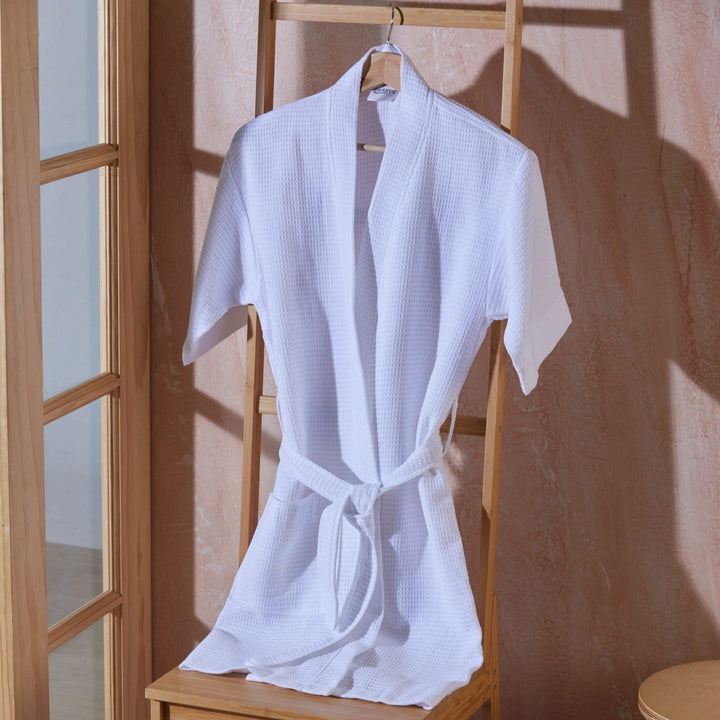 Salida de baño en diseño tipo kimono, de manga corta y color blanco, con la cual te podrás sentir en casa como en un spa, gracias a la capacidad de absorción y suavidad dada por la fibra natural del algodón.