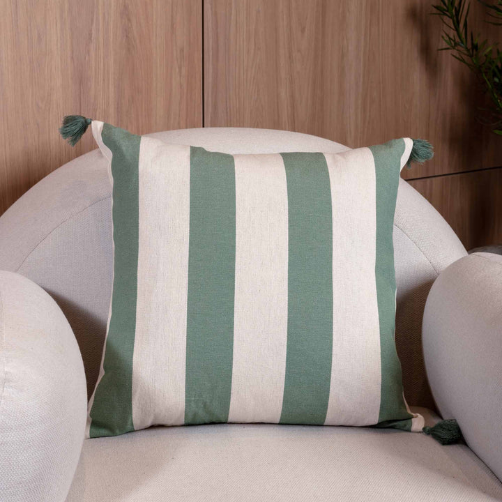 Su diseño destaca por el equilibrio entre lo rústico y lo elegante. Disponible en un patrón de rayas clásicas que aporta amplitud visual, adicional cuenta con borlas en las esquinas, un detalle que aporta movimiento y un toque artesanal único.