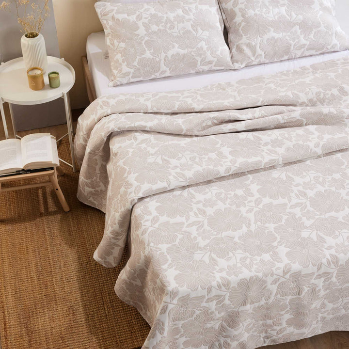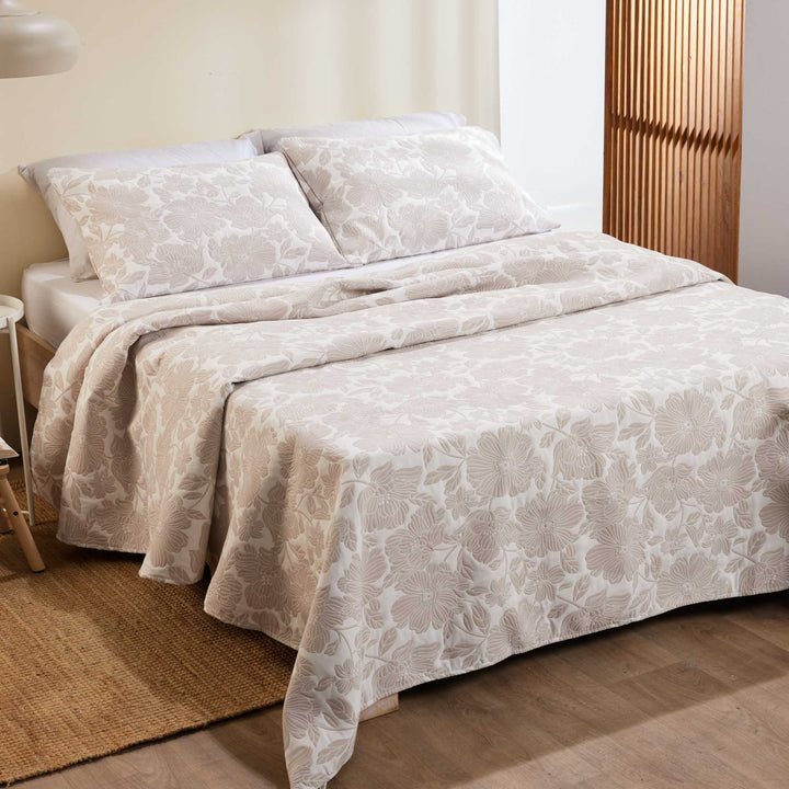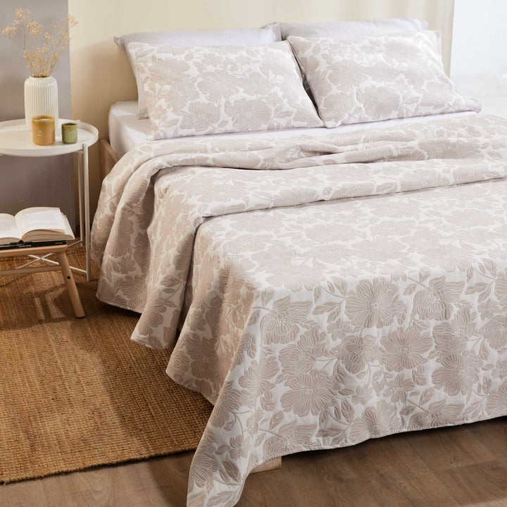 Lo que hace único al modelo Lassi es su técnica de confección en positivo y negativo. A diferencia de los estampados tradicionales, el diseño floral de este edredón se crea a través de la estructura del tejido. Esto permite que la pieza sea auténticamente doble faz: por un lado, disfrutarás de un fondo luminoso con flores en contraste, y al girarlo, los colores se invierten para ofrecer una atmósfera más íntima y acogedora. Tienes dos looks sofisticados en un solo producto.