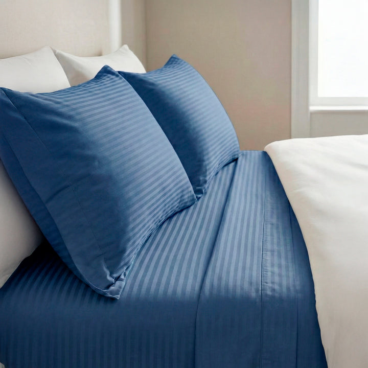 Juego de Sábanas 250 Hilos Diseño a Rayas 50% Algodón 50% Poliéster Azul Noche